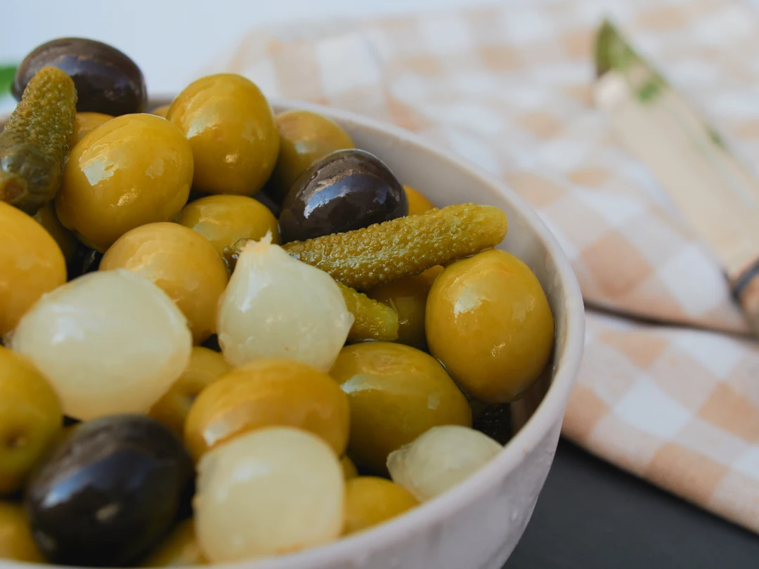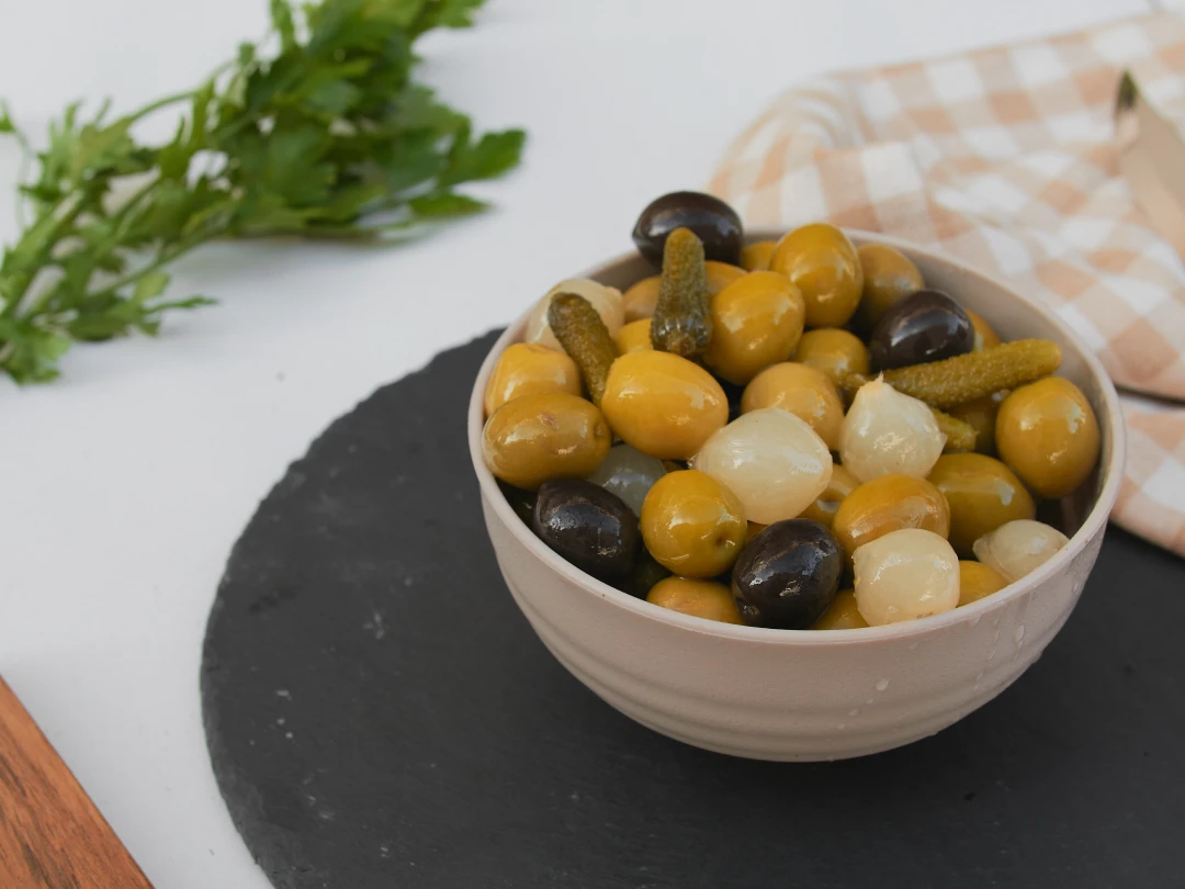 Una combinación armónica de aceitunas manzanillas, tanto blancas como negras, mezcladas con cebolletas y pepinillos crujientes. Esta mezcla es delicadamente aderezada con aceite de alta calidad, realzando los sabores naturales de cada componente.