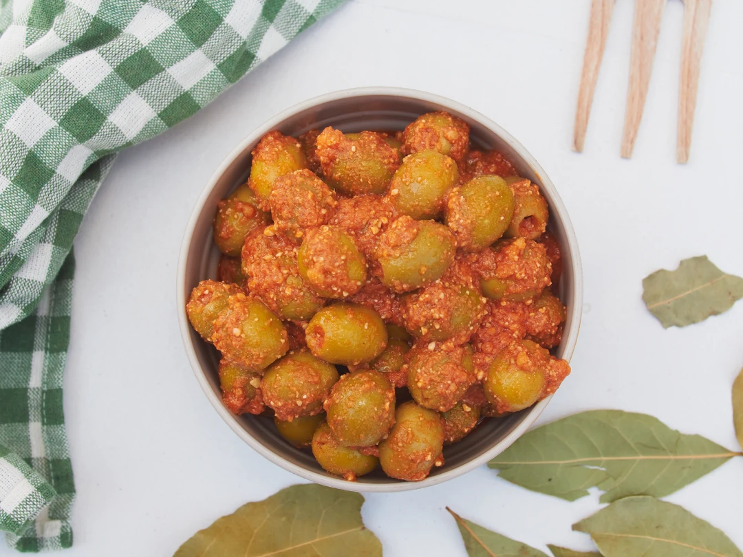 Sumergida en una generosa cantidad de salsa mojo picón, esta aceituna deshuesada es un festival de sabores y texturas. La tradicional base de pan se sustituye por frutos secos triturados , aportando un toque tostado y terroso al picante y sabroso mojo.