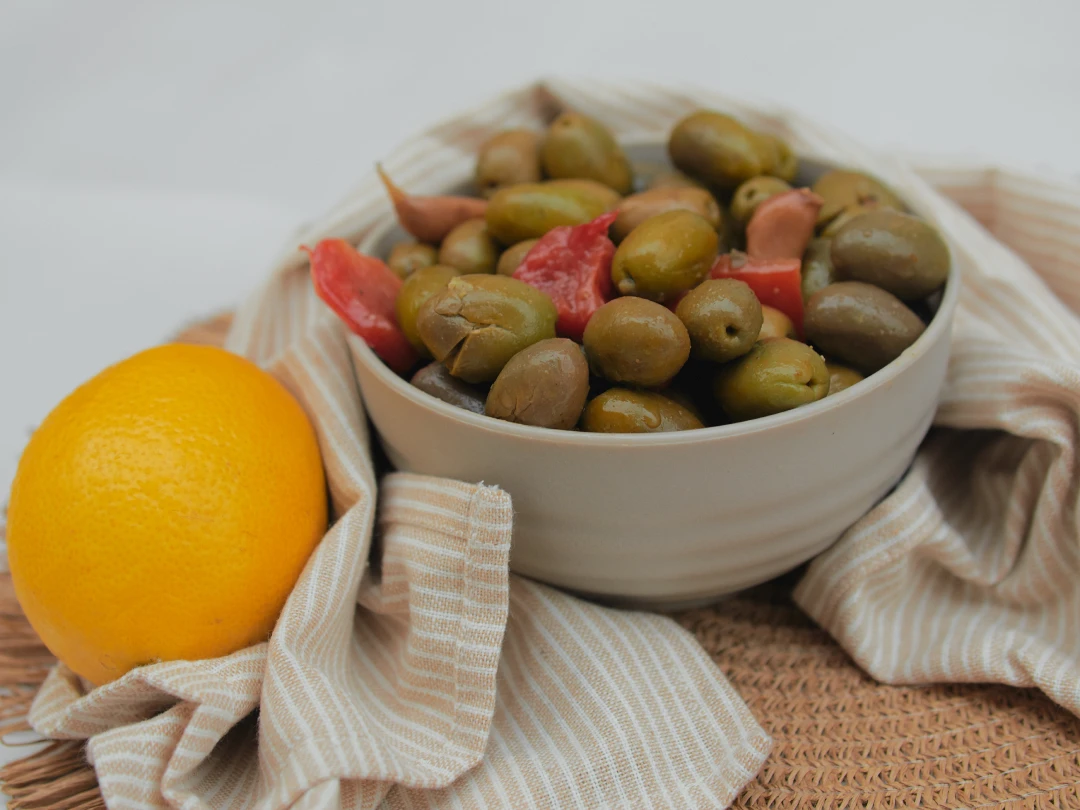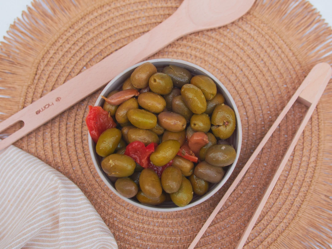 Ingredientes: Aceitunas, pimiento rojo en vinagre, ajo, comino molido, orégano molido, esencia de ajo, esencia de tomillo, acidulante (E330), conservadores (E202 y E211), antioxidante E300, agua, sal.